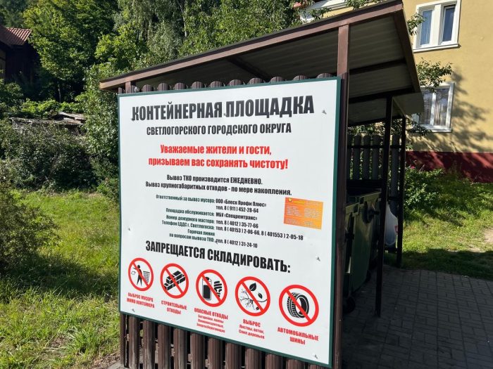Отходы с площадок централизовано вывозит единый региональный оператор. А обслуживают места для накопления отходов муниципальные бюджетные учреждения. О чем также сообщается на информационном щите вместе с графиком вывоза и контактными телефонами ответственных. Такая организация складирования и вывоза отхода возможна только тогда, когда все участники «мусорной» реформы, а это регоператор, администрация и население выполняют требования Российского законодательства, в частности, Закона «Об отходах производства и потребления» №89-ФЗ. Похоже, в регионе на Балтике у населения смогли воспитать экологическую культуру. Для гостей – информационные щиты.