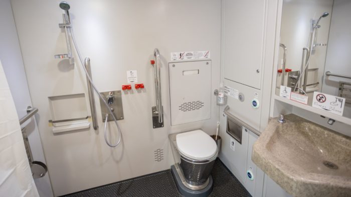 В штабном вагоне есть подъёмник и купе для инвалидов и маломобильных пассажиров. Увеличенное помещение позволяет разместить двух маломобильных пассажиров и двух сопровождающих.