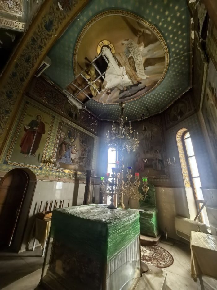 Затем в сопровождении благочинного Авдеевского округа протоиерея Андрея Карпец, владыка Пётр с Оренбургской делегацией посетили храм Святой равноапостольной Марии Магдалины. Храм уцелел при обстрелах, но весь посечен осколками снарядов.