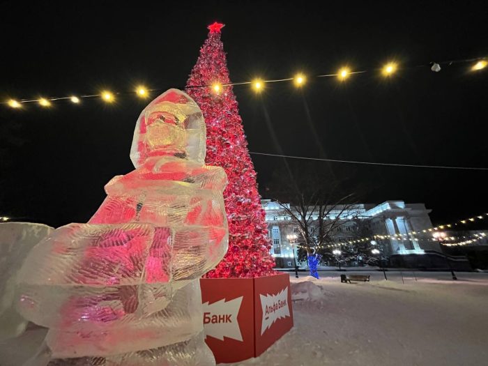 Площадь Ленина традиционно украсили фотолокациями и световыми инсталляциями. Между ними — с десяток елок. В середине композиции расположилась 25-метровая ель, одна из самых высоких в России.