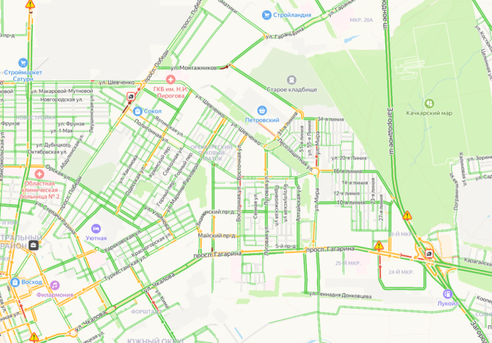 Небольшие пробки на Восточной и улице Мира. В сторону центра стоит проспект Гагарина. Традиционно в красно-желтых тонах на карте пробок — центр Оренбурга.